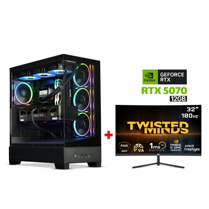 Gaming PC i7-14700F, GigaByte Z790 UD AC DDR5 WiFi MB, 32GB DDR5 RAM, 2TB NVMe SSD, ZOTAC RTX 5070 12GB VGA, AZZA L240 Liquid Cooler, 850 WATT GOLD PSU, Asus A31 Plus Mid Tower Case Black, Windows 11 Pro License, Twisted Minds 32″ VA Curved Gaming Mo