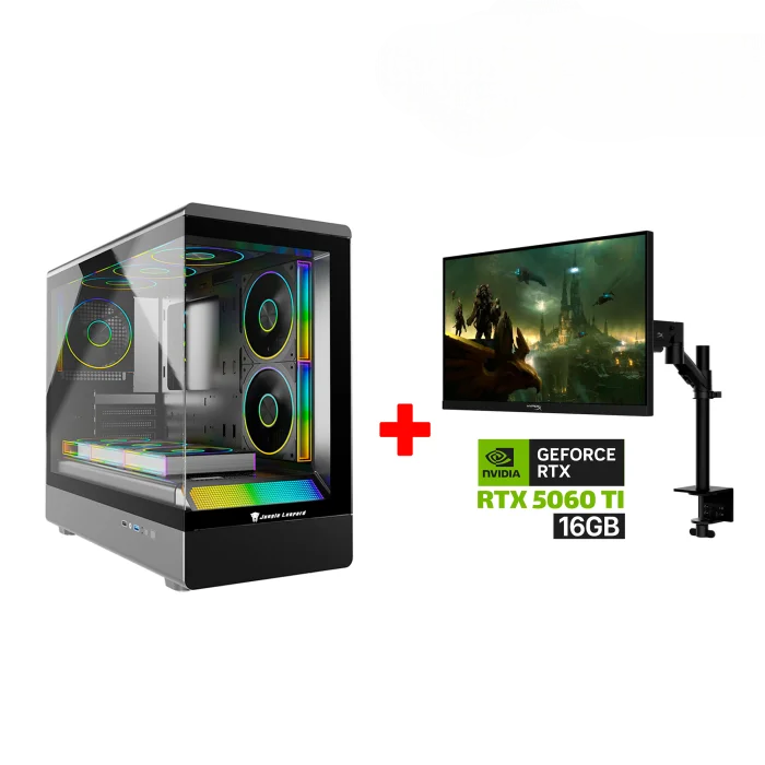 Gaming PC i5-14400F Processor, H610 D5 WIFI Motherboard, 16GB DDR5 RAM, 1TB NVMe SSD, RTX 5060 TI 16GB VGA, 750 WATT PSU, Jungle Leopard MS-01 Micro ATX Tower Case, Windows 11 Pro (License) + HyperX Armada 25″ FHD 240Hz Gaming Monitor