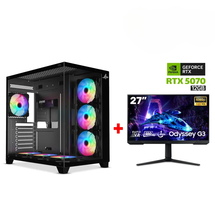 Gaming PC i7-14700F,GigaByte Intel B760M G AX WIFI DDR5 MB,32GB DDR5 (6000) RAM,1TB NVMe SSD,RTX 5070 12GB VGA,850 Watt GOLD PSU,AZZA L240 Liquid Cooler,Sharx Profin XI700B Case Black,Win 11 Pro License,Samsung Odyssey G3 27″ VA FHD 180Hz Gaming Monitor